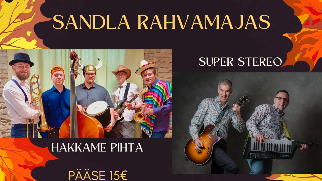 Traditsiooniks saanud sügispeol esineb seekord meeleoluka muusikalise eeskavaga ansambel "Hakkame pihta" ja tantsuks mängib ansambel "Super Stereo". Kohtade broneerimine tel 53025620, pääsmed eelmüügis Sandla rahvamajas ja kaupluses ning õhtul kohapeal. Lauake kata ise. Avatud kohvik.