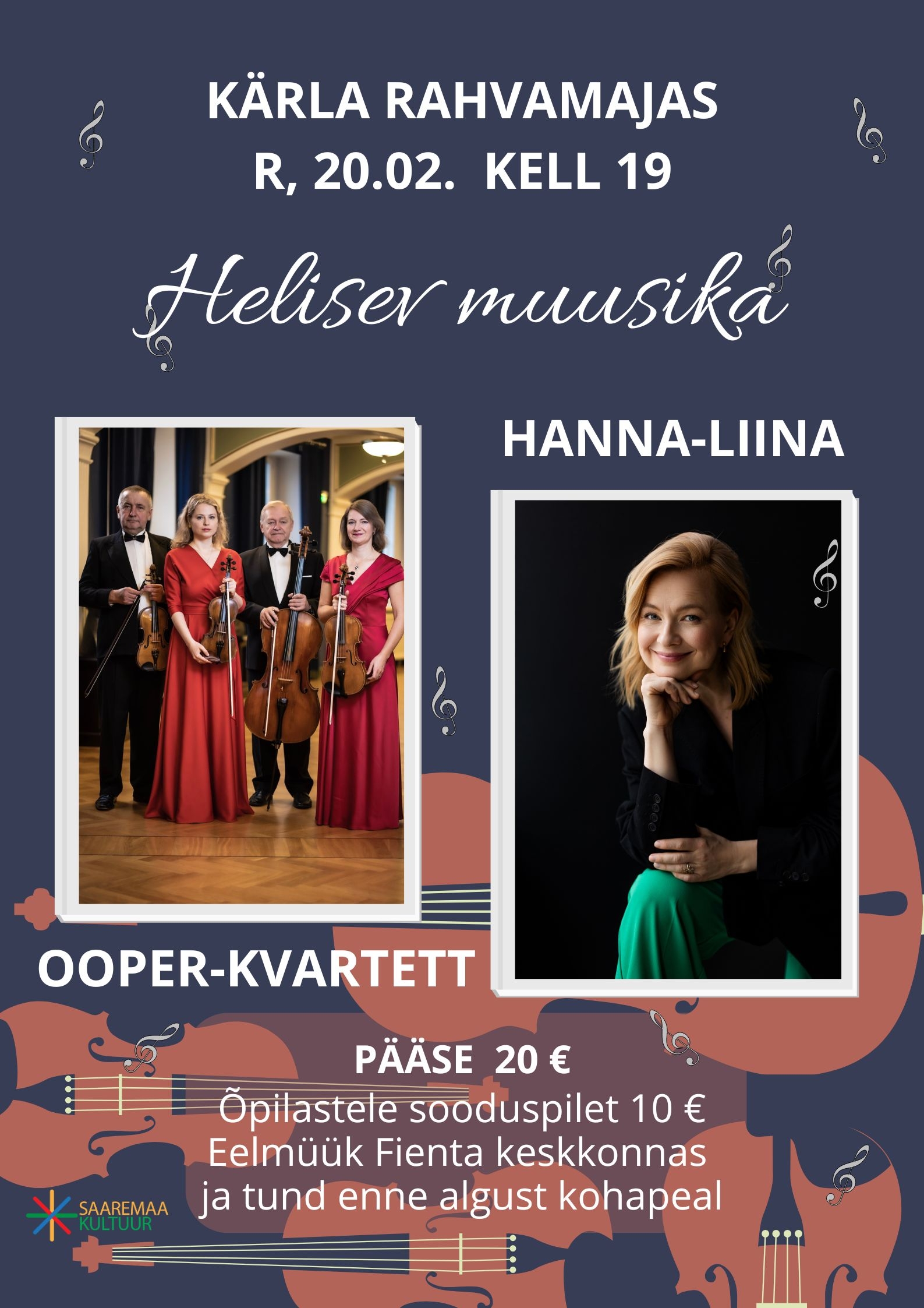 Piletid eelmüügis Fienta keskkonnas https://fienta.com/et/helisev-muusika-hanna-liina-vosa-ja-ooper-kvartett-karla-rahvamajas