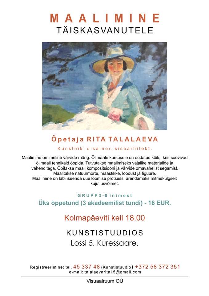 Õlimaali kursusele on oodatud kõik huvilised, keda paelub kunst ja soov õppida õlimaali tehnikaid ning arendada oma isikupärast väljendusviisi. See on võimalus sukelduda maailma, kus iga pintslitõmme loob midagi uut ja ainulaadset.